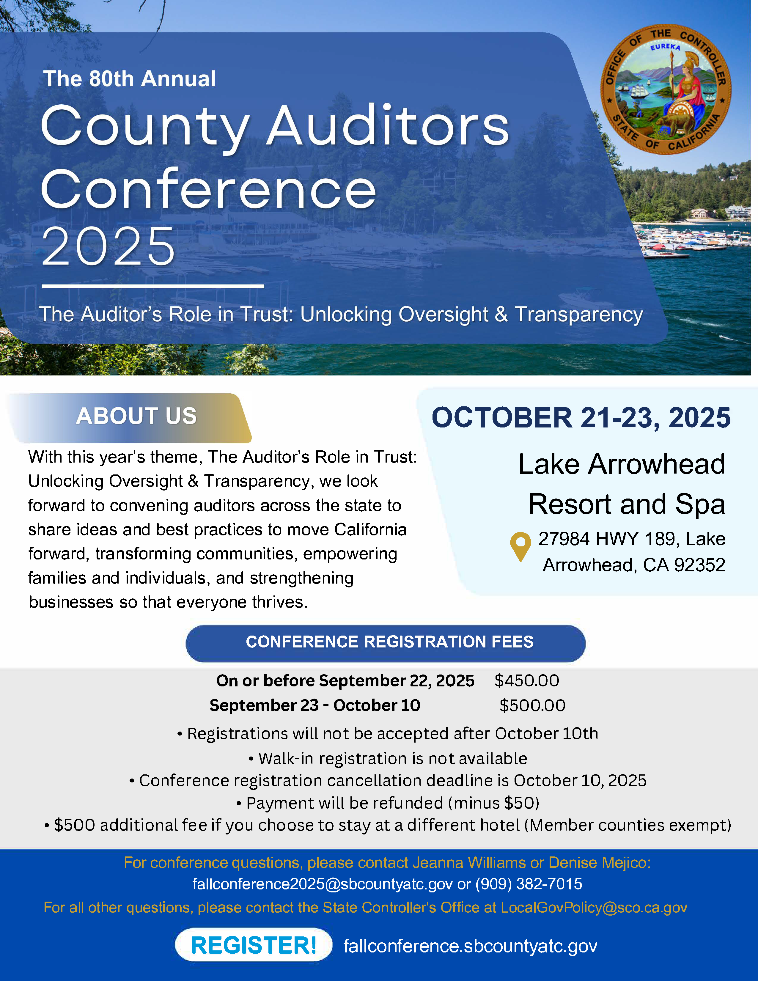 California State Controller Malia M. Cohen is pleased to announce the California Controller’s 80th Annual County Auditors Conference at Lake Arrowhead Resort & Spa on October 20-23, 2025!