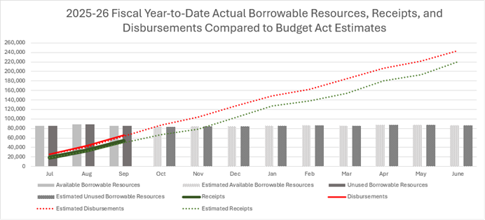 As noted in the Controller’s Monthly Statement of General Fund Cash Receipts and Disbursements, receipts for the fiscal year through September exceeded estimates contained in the 2025-26 Budget Act by $4.5 billion, or 9 percent. Fiscal year-to-date expenditures were higher than Budget Act estimates by $2.1 billion, or 3.3 percent.